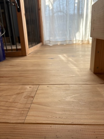 すでに、カフェ板で仕上げた床に少しずつ傷がついてきました。
