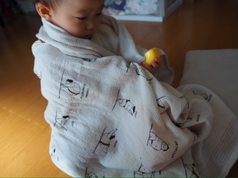 0歳の子は、少しガーゼっぽい大きめの手ぬぐいを使用。